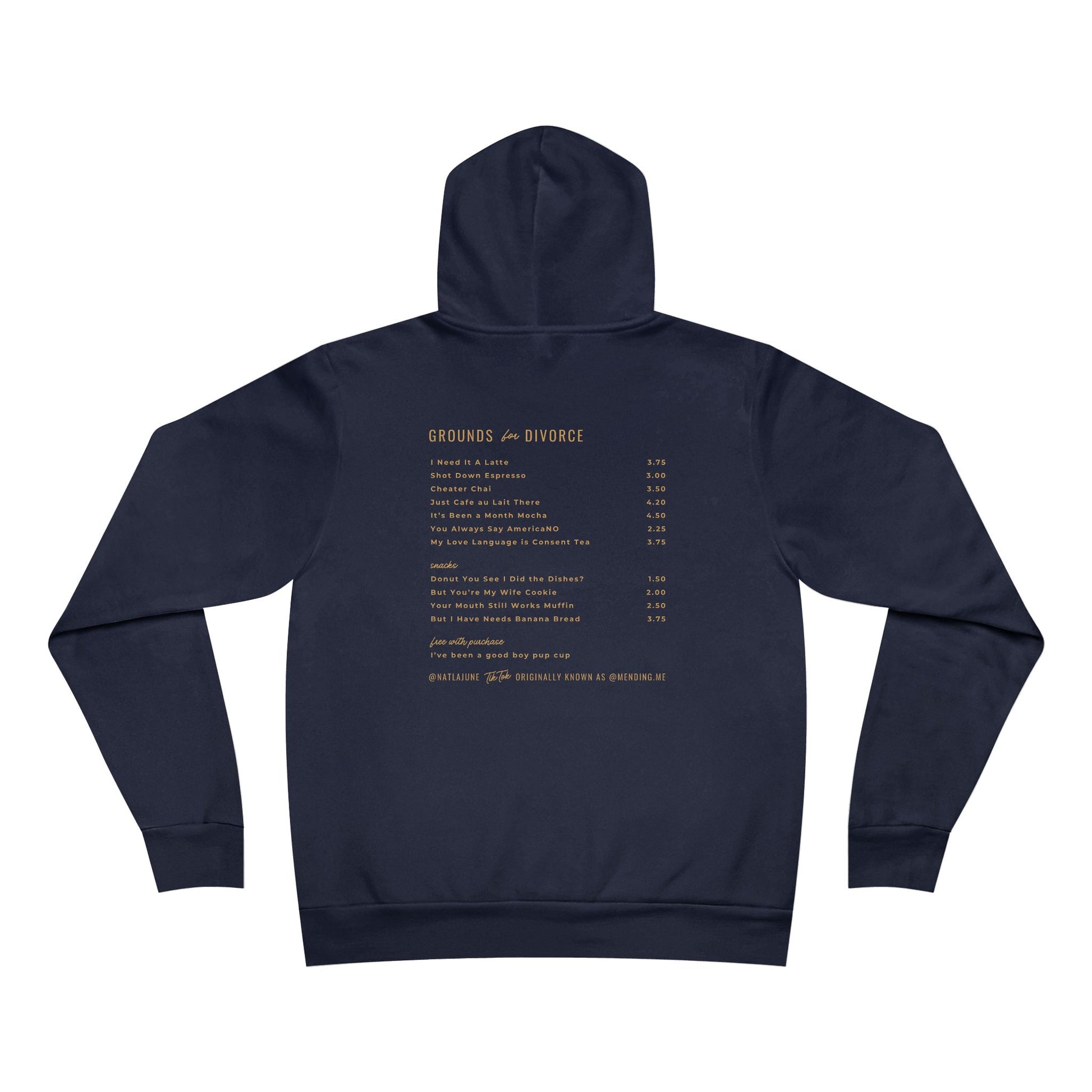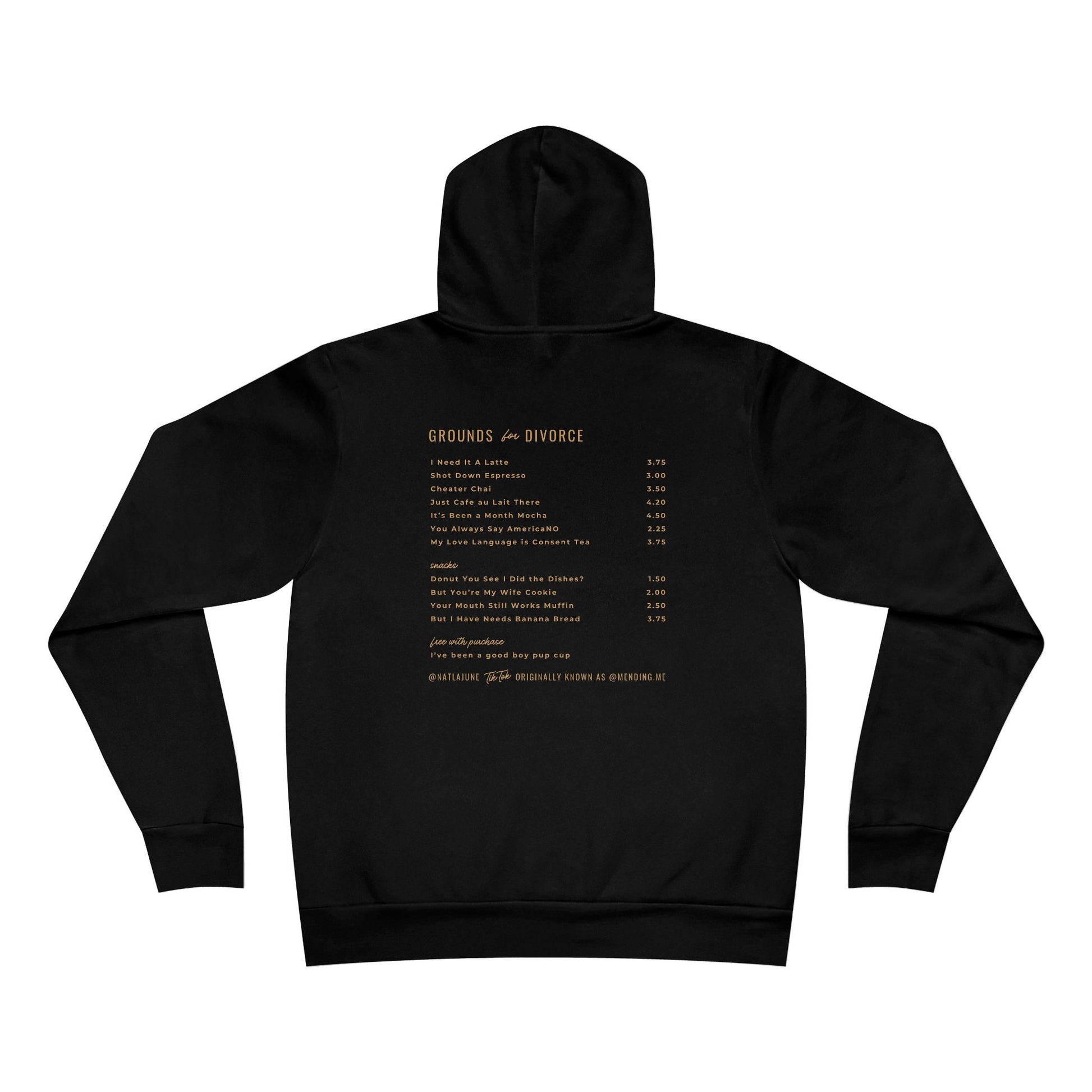 This is a fake coffee shop I made up as a joke in a TikTok video, but for fun I made a hoodie with a menu of coercive phrases from The Playbook.